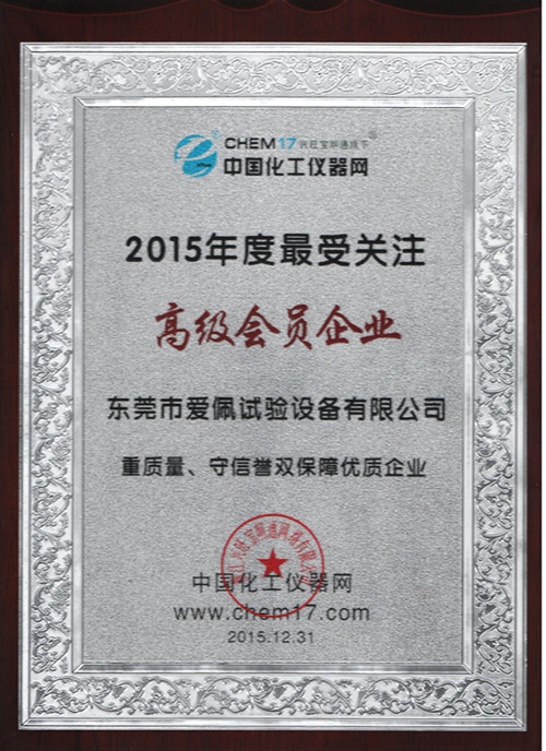 恭喜愛佩科技(全稱:東莞市愛佩試驗設備有限公司)于2015年12月31日被榮獲中國化工儀器網2015年度最受關注高級會員企業、2015年重質量、守信譽雙保障優質企業。