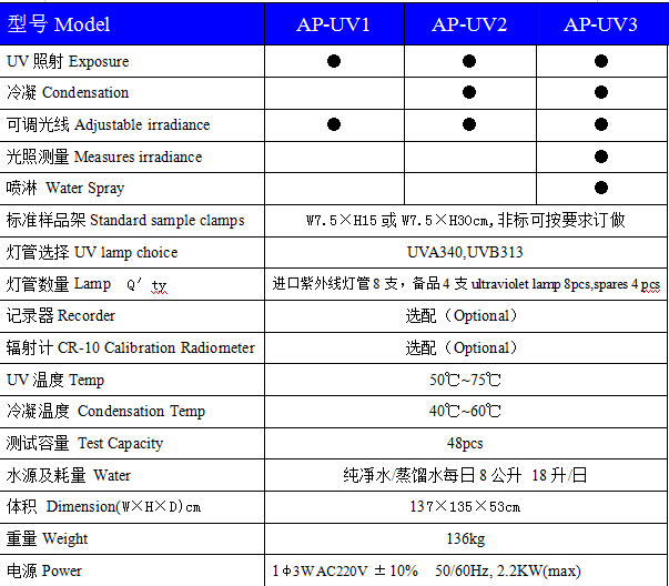 符合國際測試標(biāo)準(zhǔn):ASTM D4329、ISO 4892-3、ISO 11507、SAE J2020等現(xiàn)行紫外線老化試驗(yàn)標(biāo)準(zhǔn)。